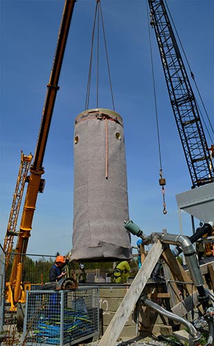 Bild 5: Fertig zur Montage: Ein mit Geovlies umwickelter GFK-Schachtring am Ausleger eines Schwerlastkrans