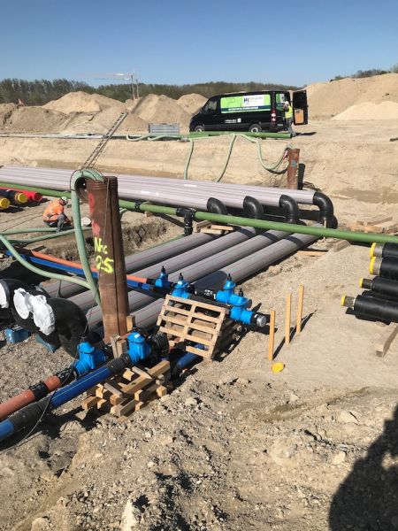 Bild 2.1/2.2: Kolonneneinsatz der Fa. Hopfgartner auf der Baustelle IN-Campus Ingolstadt -Fachgerechte Verschweißung und Flanschverbindungen von Kunststoffrohren, Formstücken und Absperrschiebern Quelle: Hopfgartner GmbH / Strabag AG