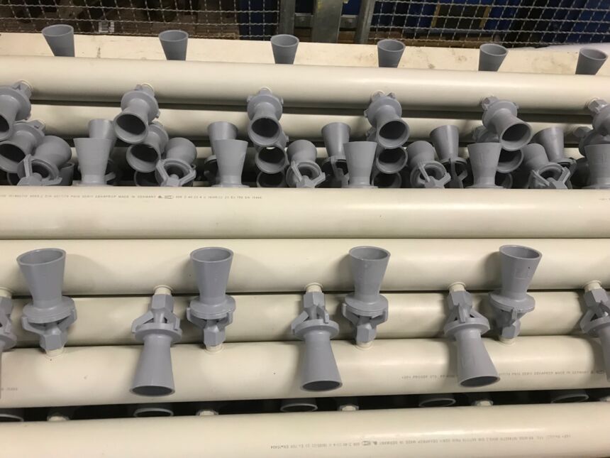 Flutrohre mit Düsen aus PP-H unterstützen die Lackumwälzung im KTL-Becken. Dadurch wird der Lack gleichmäßig durchgemischt und Pigmentsedimentation wird vorgebeugt. Hopfgartner fertigt die Flutrohre angepasst auf die jeweilige Beckengeometrie und statten sie je nach Kundenbedarf mit entsprechender Anzahl und Art von Düsen aus.