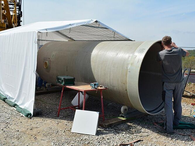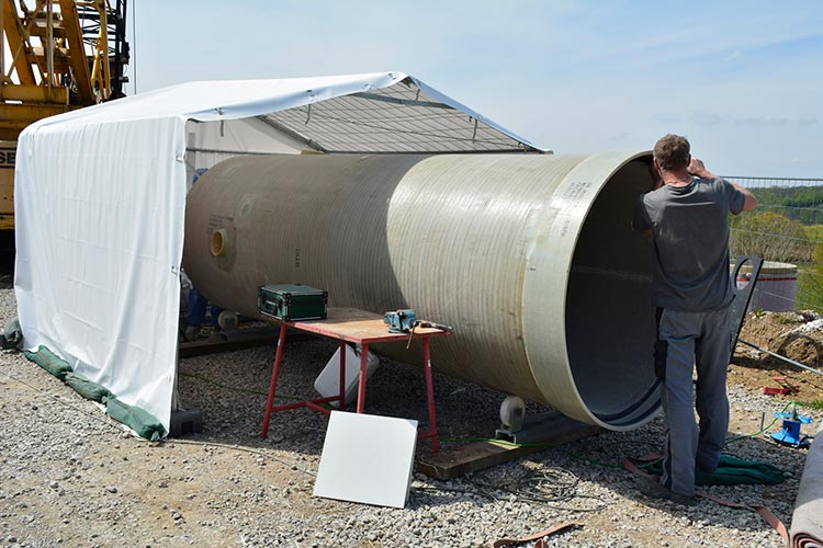 - Vorfertigung der GFK-Schachtelemente der Nennweite DN 1600 aus GFK mit Muffenverbindung sowie mit Geovliesummantelung