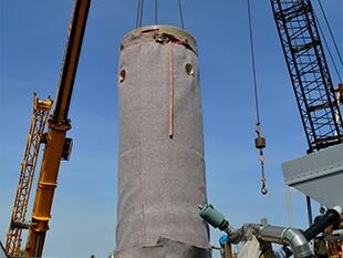 Bild 5: Fertig zur Montage: Ein mit Geovlies umwickelter GFK-Schachtring am Ausleger eines Schwerlastkrans