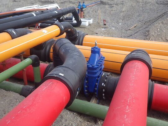 Bild 3: Montierte Rohrbögen, Sattelstücke aus PE100 und Absperrschieber aus duktilem Gusseisen GGG Quelle: Hopfgartner GmbH / Strabag AG