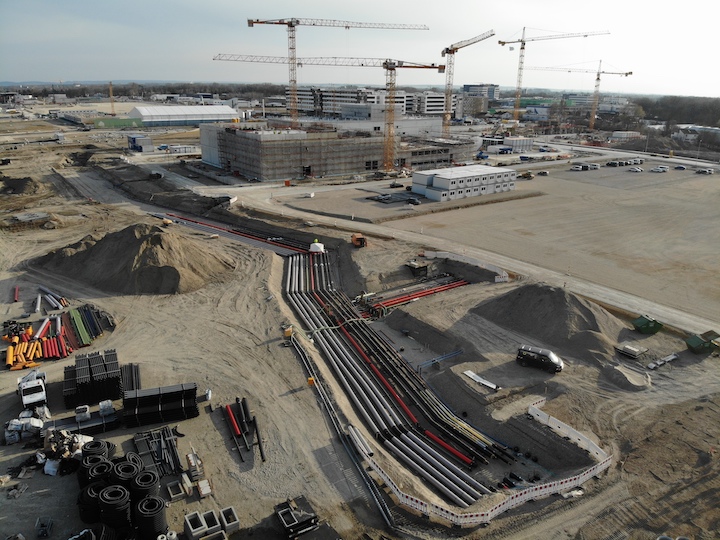 Die Absteckung der Rohrleitungsgräben in der offenen Bauweise erfolgt digital, der Aushub erfolgt mit einem maschinengesteuerten Bagger und die Einmessung der Kunststoffrohre- und -Formstücke mit digitalen Vermessungsgeräten. Die Verlegung der unterschiedlichen Rohrleitungen erfolgt in der offenen Grabenbauweise in einem gemeinsamen Rohrgraben. Die unterschiedlichen Leitungsdimensionen von DN 32 bis DN 800 aus recyclebarem PE100 für Low-Exergie-Rohrleitungen, Vor- und Rücklaufleitungen, Sprinklerleitungen, Wärmeleitungen für Vor- und Rücklauf, Kälteleitungen für Vor- und Rücklauf, Betriebswasser- und Brunnenzuleitungen, Vakuumabwasserleitungen, Abwasserfreispiegelleitungen sowie Kabelleerrohrsysteme müssen hierfür teilweise individuell vom Rohrhersteller GERODUR gefertigt werden. Die Kunststoffrohrverlegung erfolgt durch bewährte Verbindungstechniken wie stoffschlüssiges Heizwendelschweißen, Heizelementstumpfschweißen und lösbaren Flanschverbindungen zur Anbindung von Formteilen aus anderen Werkstoffen, wie z. B. Absperrschieber.