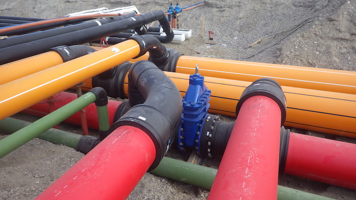 Das gesamte LowEx-Rohrnetz mit dem Austausch von Wärme und Kälte zwischen allen Gebäuden sowie der Kabelleerrohre umfasst laut Bauherren eine gesamte Leitungslänge von 105 Kilometern.